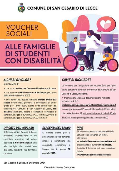 Il Comune di San Cesario di Lecce avvisa che è possibile presentare domanda per la concessione di un contributo per il servizio di trasporto scolastico rivolto alle famiglie con minori con disabilità, frequentanti la scuola dell'infanzi...