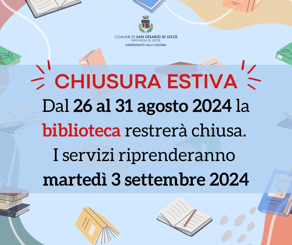 CHIUSURA ESTIVA dal 26 al 31 agosto 2024 della Biblioteca.