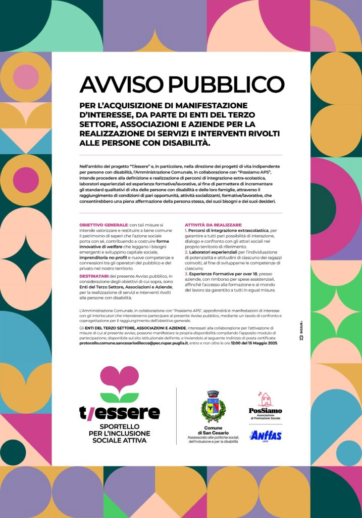 Avviso pubblico per l’acquisizione di manifestazione d’interesse, da parte di enti del terzo settore, associazioni e aziende per la realizzazione di servizi e interventi rivolti alle persone con disabilità.