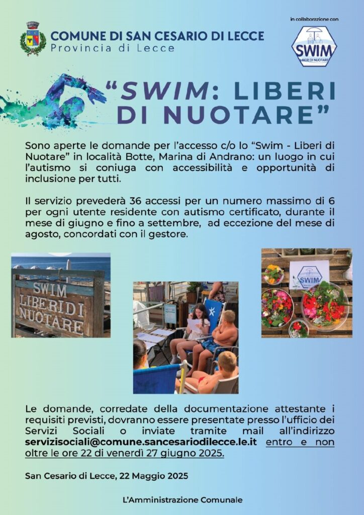 Sono aperte le domande per l’accesso c/o “Swim – Liberi di Nuotare”, Marina di Andrano.